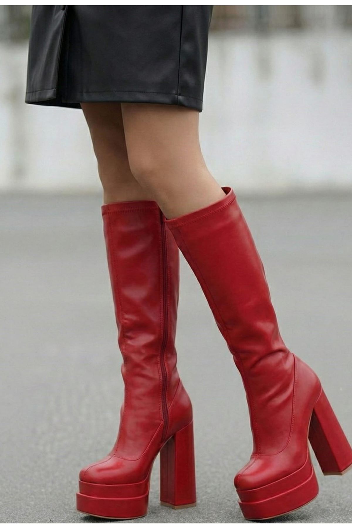 Bayonn Kırmızı Cilt Kadın Çift Platform Yüksek Topuklu Çizme