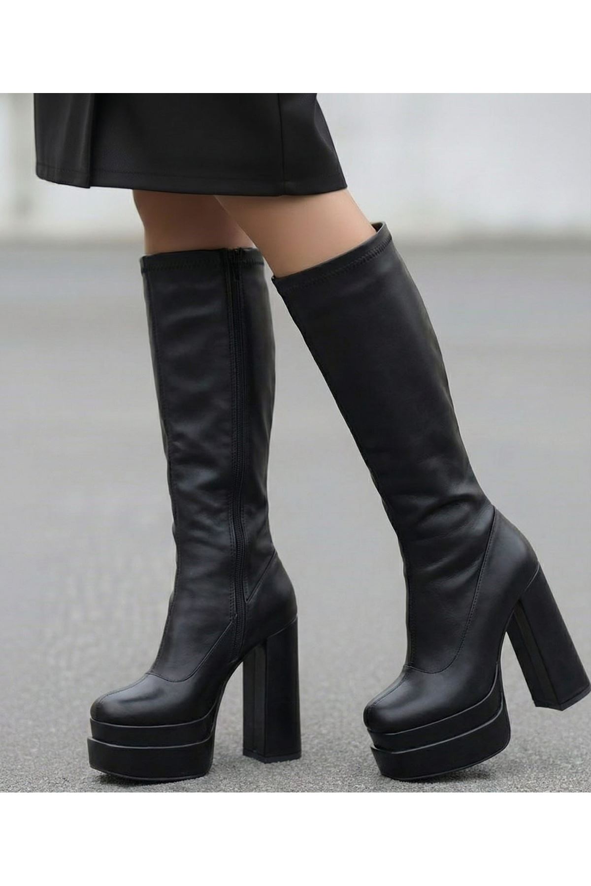 Bayonn Siyah Cilt Kadın Çift Platform Yüksek Topuklu Çizme